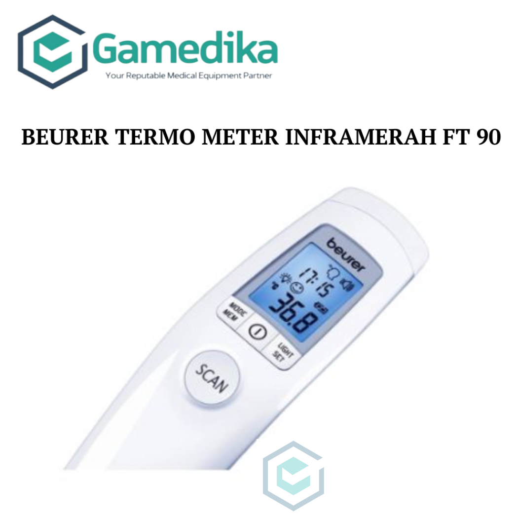 "Harap konfirmasi terlebih dahulu. TERMOMETER DIGITAL beurer FT 90 - non kontak (tidak kontak dengan kulit) Original, bergaransi resmi 5 (lima) tahun KEMENKES RI AKL 20901312750 Fitur teknis : 1. Hasil pengukuran dalam 1 detik 2. Pengukuran suhu badan, ruangan dan object 3. Aman dan higienis. Pengukuran tanpa kontak dengan kulit 4. Sangat cocok untuk pengukuran suhu badan bayi dan anak-anak 5. Alarm panas badan 6. Pengukuran mudah dibaca dan menyala biru (bisa dibaca saat gelap) 7. Mempunyai 60 memori (suhu badan) 8. Otomatis off setelah beberapa saat tidak dipakai 9. Dilengkapi dengan kotak penyimpanan plastik Kelengkapan yang anda dapatkan : 1. Alat Termometer Digital beurer FT90 - 1 unit 2. Kotak Penyimpanan 3. Baterai AAA x 2 pcs (terpasang) 4. Kartu Garansi 5. Buku panduan pemakaian "