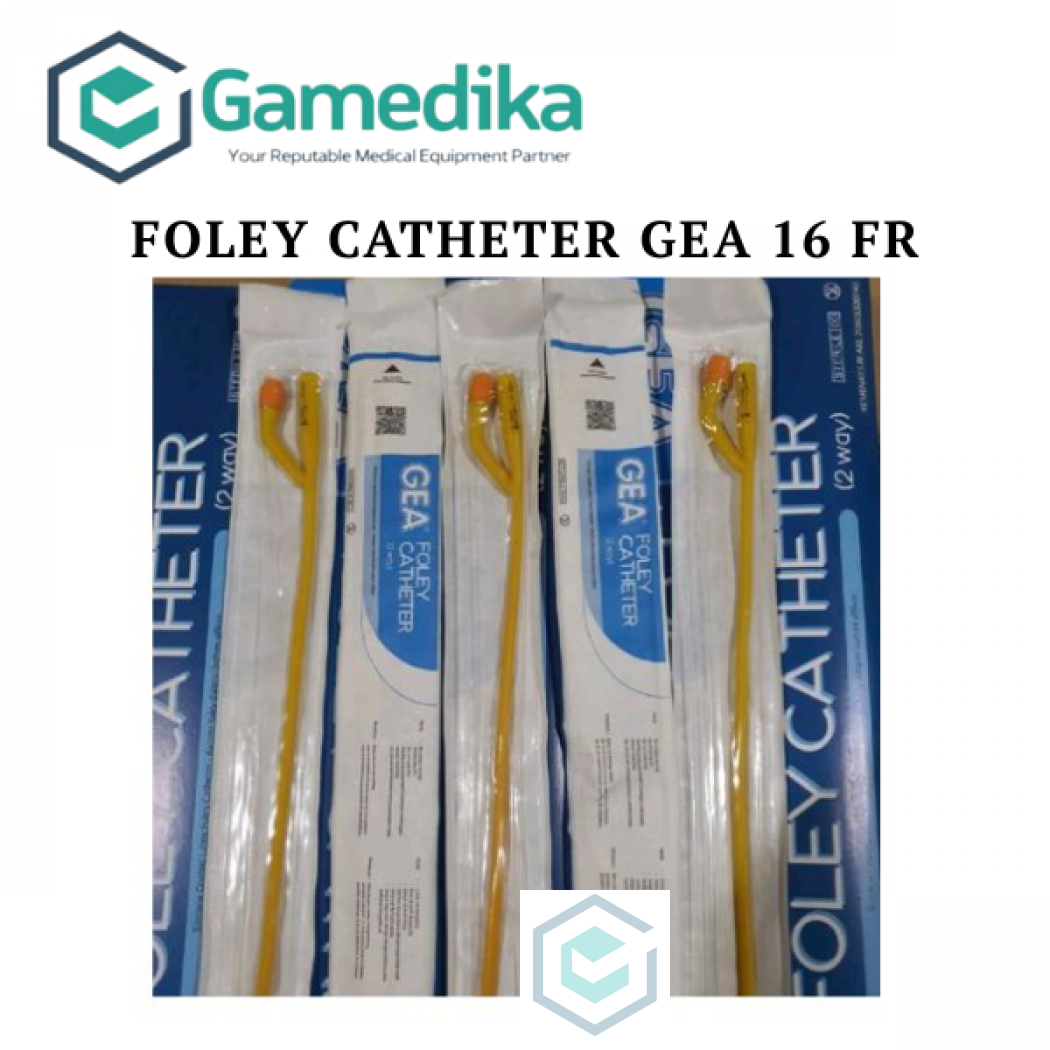 Harap konfirmasi terlebih dahulu "Foley Catheter GEA 16 FR Fungsi: Mengalirkan air seni dari kandung kemih. Digunakan untuk pasien yang tidak mampu buang air kecil secara normal atau mengalami retensi urine. Ukuran (16 FR): French (FR) adalah satuan ukuran diameter kateter, sehingga 16 FR berarti diameter kateter tersebut 16 French. Bahan: Umumnya terbuat dari latex. Struktur: Memiliki dua cabang (two-way). Satu cabang adalah saluran untuk mengalirkan urine. Cabang lainnya digunakan untuk mengisi dan mengempiskan balon yang menahan kateter di dalam kandung kemih. Pemasangan: Memerlukan prosedur medis di mana kateter dimasukkan melalui uretra (saluran kencing) hingga mencapai kandung kemih. Penggunaan: Dapat digunakan untuk memantau produksi urine dan kondisi urologi lainnya.