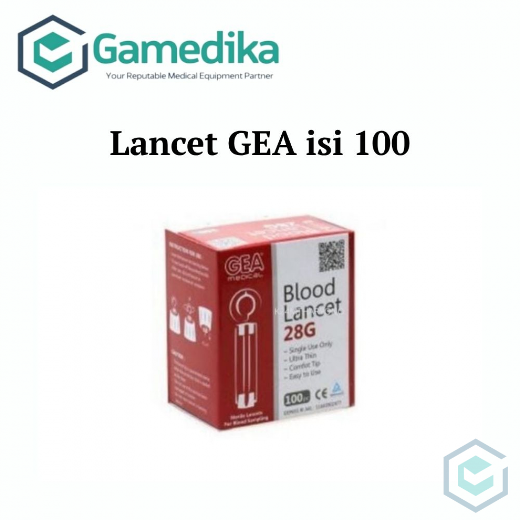 Harap konfirmasi terlebih dahulu. Blood Lancet GEA 28G isi 100 GEA medical blood lancet 28g 100 pcs merupakan jarum steril sekali pakai yang digunakan untuk mengecek darah. > Cocok digunakan dengan applikator dari merek yang sejenis. > Praktis dan mudah digunakan, sehingga pengecekan gula darah, kolesterol, maupun asam urat dan pengecekan darah secara keseluruhan dapat terjamin keamanan nya. Kegunaan : Sebagai alat kesehatan berupa jarum steril Cara menggunakan : Bersamaan dengan applikator nya. Harus diperhatikan : > Hanya digunakan sekali saja, jangan digunakan lebih dari sekali. > Harus dibuang dalam kondisi jarum yang sudah tertutup dengan penutupnya agar tidak terjadi pencemaran sampah oleh darah.