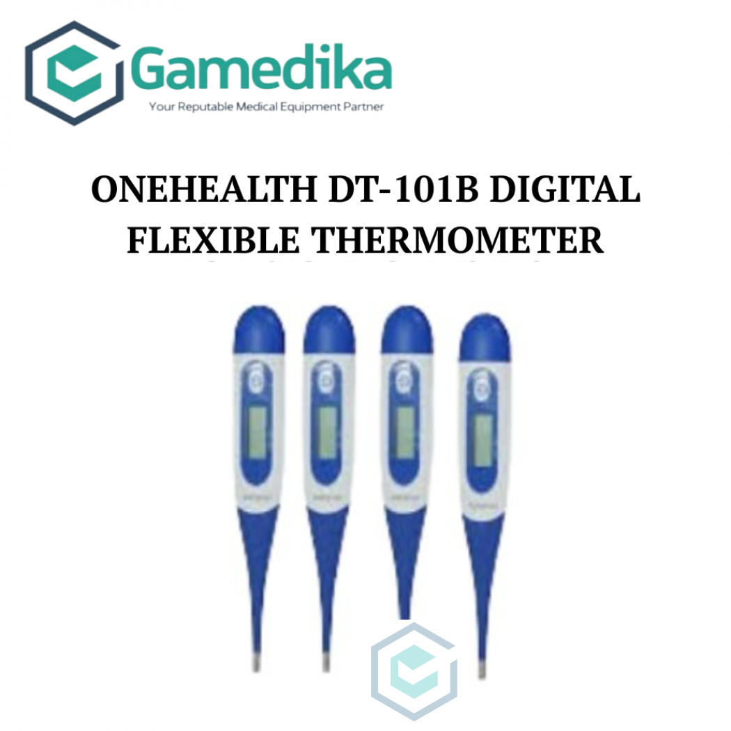 "Harap konfirmasi terlebih dahulu. Onehealth DT-101B Digital Flexible Thermometer Spesifikasi: - Dipakai melalui mulut/ anus/ pun ketiak - Lama pengukuran 1 menit - Non Mercury (bebas merkuri) - Flexi Tip, ujung probe yang lentur, aman untuk anak-anak - Waterproof - Layar digital mudah dibaca - Ergonomis, bentuk bergelombang di dekat layar untuk dipegang jari - Alat mati secara otomatis setelah 10 menit dan ada indikator baterai lemah - Dilengkapi alarm pengukuran selesai - Dilengkapi memori pengukuran terakhir - Jarak pengukuran 32-42 derajat Celcius, akurasi +/- 0.1 C - Sudah siap pakai dan dilengkapi baterai jam di bagian dalam tutup abu-abu di sebelah tombol, (penggantian baterai buka tutup tersebut dan ganti dengan baterai jam yang baru) Cara pemakaian singkat: 1. Tekan tombol ON/OFF sampai di sebelah layar muncul tanda L dan C yang berkedip-kedip, pengukuran siap dilakukan. 2. Letakkan tip sensor pada bagian yang diukur (mulut/ketiak/anus) 3. Terdengar bunyi """"bip bip"""" pengukuran selesai dan hasil bisa dibaca (lama pengukuran +/- 1 menit) 4. Tekan tombol ON/OFF untuk mematikan, atau akan mati sendiri setelah 10 menit tidak digunakan KEMENKES RI AKL 20901420009"
