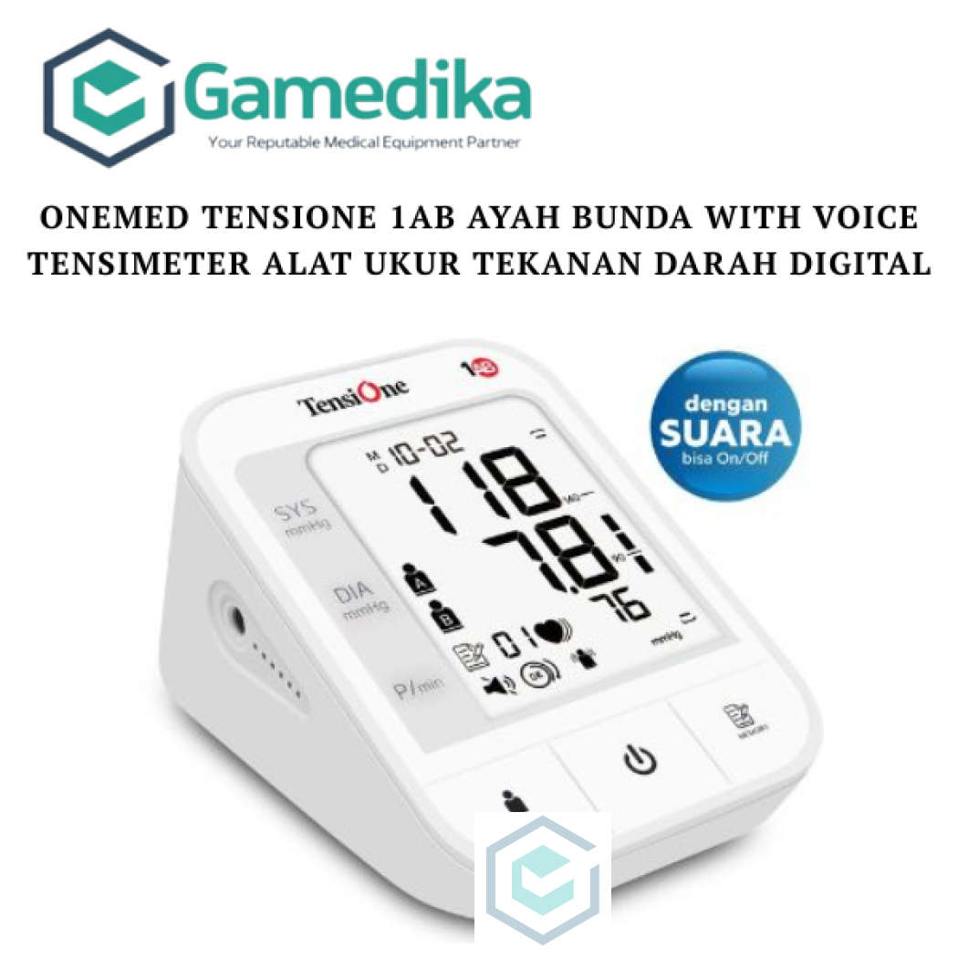 "HARAP KONFIRMASI TERLEBIH DAHULU. Onemed TensiOne 1AB Ayah Bunda w/ Voice adalah alat pengukur tekanan darah digital otomatis yang praktis dan mudah digunakan. Alat ini dirancang untuk digunakan di lengan atas dan memiliki tingkat akurasi yang tinggi. Dalam pengujian, hasil pengukuran dengan alat ini menunjukkan perbedaan yang sangat kecil (hanya 3 mmHg) dibandingkan dengan tensimeter merk HG, seperti yang dibuktikan oleh dokter menggunakan tensimeter HG Riester dan alat kalibrasi Fluke. Alat ini juga dilengkapi dengan dua memori, memungkinkan dua orang untuk menyimpan hasil pengukurannya masing-masing. Fitur: - Dilengkapi dengan suara berbahasa Indonesia yang membacakan hasil dan memberikan panduan penggunaan. - Paket sudah termasuk USB kabel, 4 baterai, dan tas serut. - Alat ini beroperasi dengan tenang dan tidak berisik saat memompa. - Mansetnya cocok untuk lengan dengan diameter 22-45 cm, sehingga bisa digunakan oleh orang dengan berbagai ukuran lengan. - Layar LCD besar yang memudahkan pembacaan hasil. - Memiliki deteksi pemakaian manset, dengan simbol berkedip jika pemakaian tidak benar. - Indikator IHB (Irregular Heartbeat) yang menunjukkan adanya kelainan irama jantung dengan simbol hati pada hasil tensi. - Deteksi gerakan tubuh, dengan simbol berkedip jika terdapat banyak gerakan saat pengukuran. - Memori 74x2 set, memungkinkan penyimpanan data untuk dua pengguna. - Menampilkan rata-rata dari tiga hasil pengukuran terakhir. - Dilengkapi dengan tampilan waktu dan tanggal yang dapat diatur. Spesifikasi: - Display: LCD - Metode Pengukuran: Oscillation measuration - Rentang Pengukuran: Tekanan darah 0-300 mmHg, denyut nadi 40-200/menit - Presisi: Tekanan darah 3 mmHg, detak jantung 5% dari nilai terbaca - Ukuran manset: Diameter lengan 22-45 cm - Dimensi alat: 127 x 92 x 68 mm - Sumber Daya: 4 baterai AA, USB 5V/1A DC (sudah termasuk) Satuan: Set AKL 20501420044 "